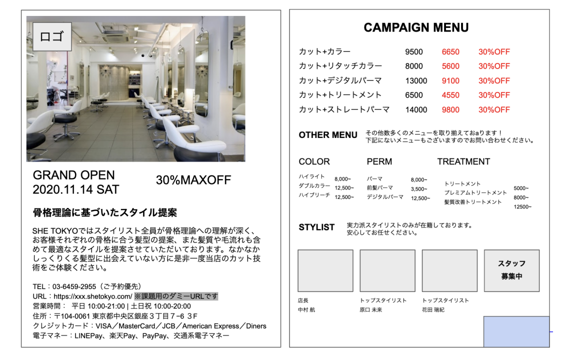 「料金は高くてもスタイリストの腕を重視する」層がターゲットであること、さらに自分磨きのために通う「美容室」の広告であることを考慮し、以下の工夫をすることで高級感がありつつも垢抜けられそうだと感じてもらえるデザインを目指しました。