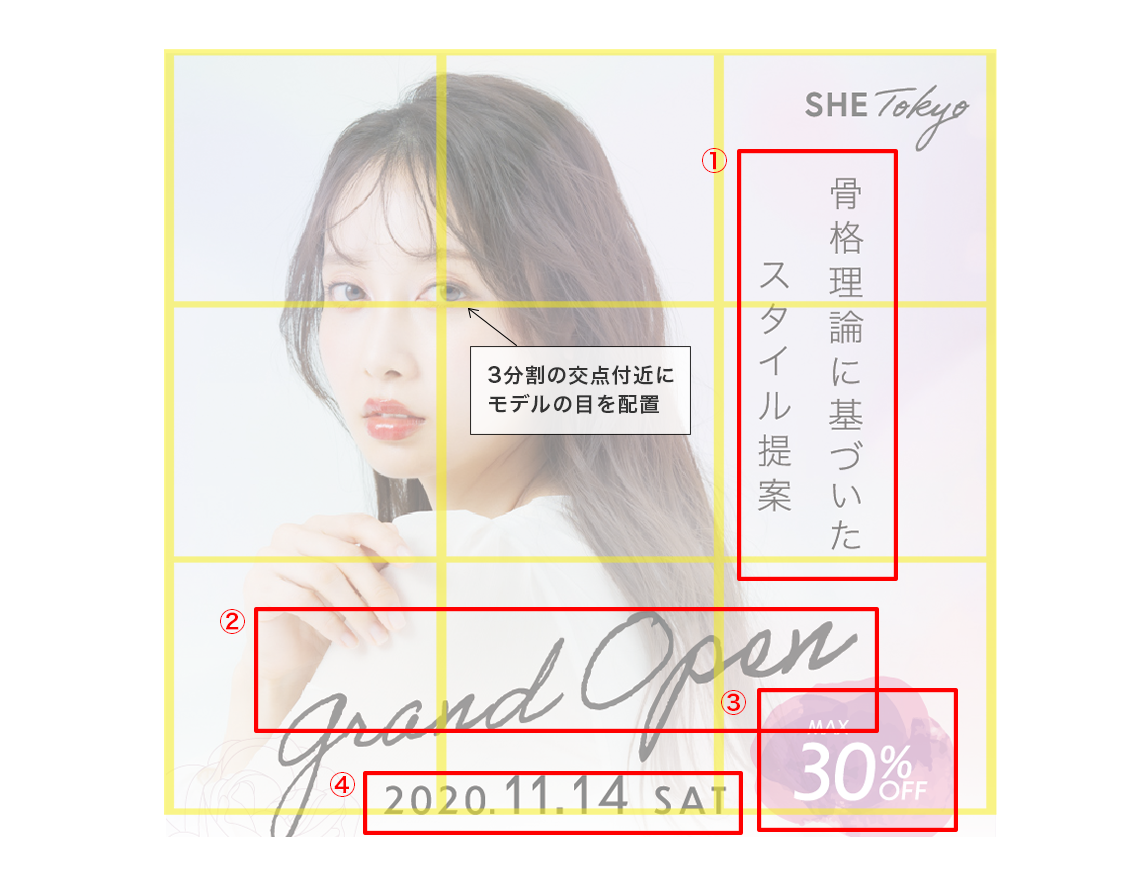 また、KVを3分割した交点付近にモデルの目を配置することでより写真の印象を強め、そこから優先順位に沿って①〜④の順で視線がZ状に流れるように文字情報を配置しました。