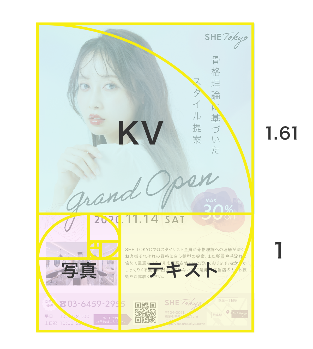 フライヤーは目を惹くものがないとすぐに捨てられると考え、人間が美しいと感じる金属比の一つである黄金比*を参考に取り入れることでひと目で美しく読み進めたくなるレイアウトを作成しました。