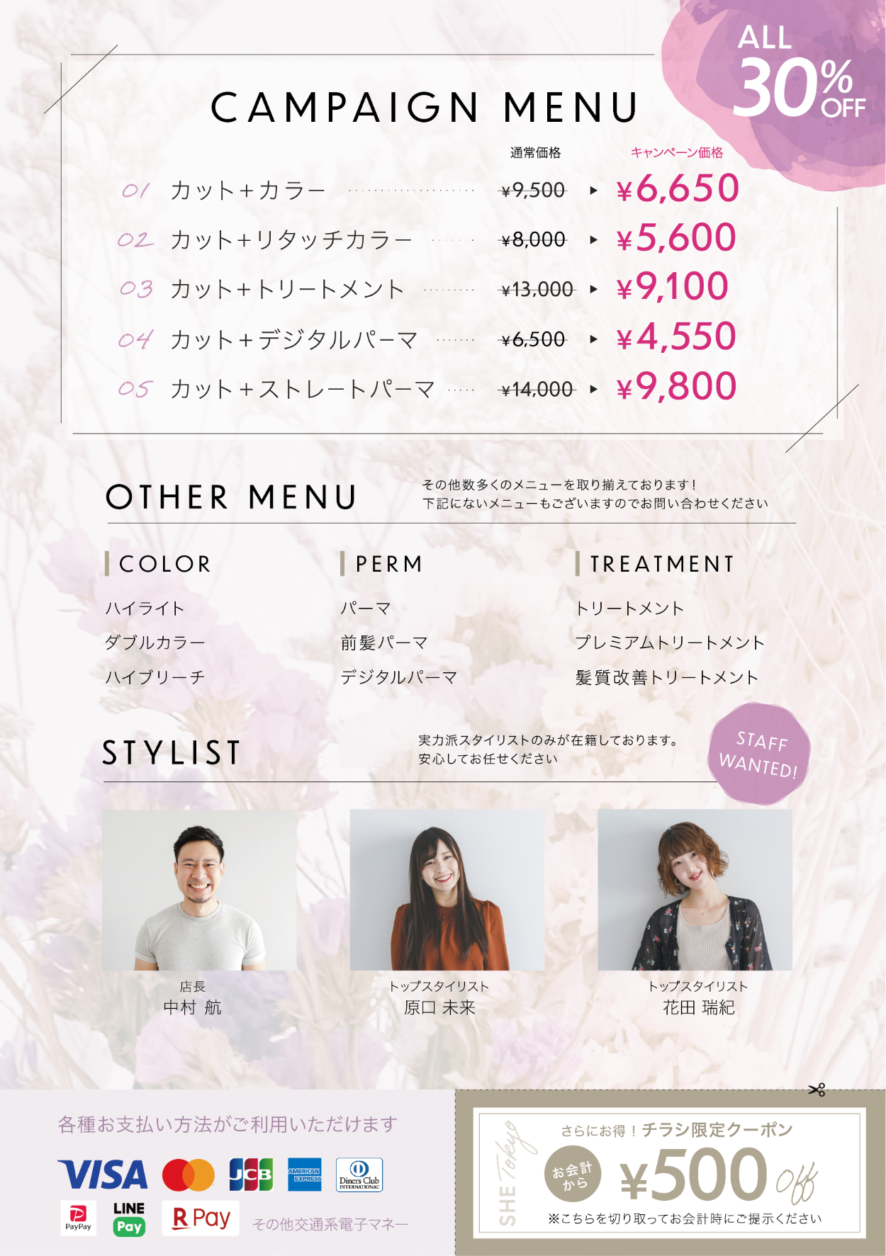 裏面のキャンペーンメニューを他のメニューよりも大きく・さらに背景色や枠を使って目立たせることで、訴求力を強めました。