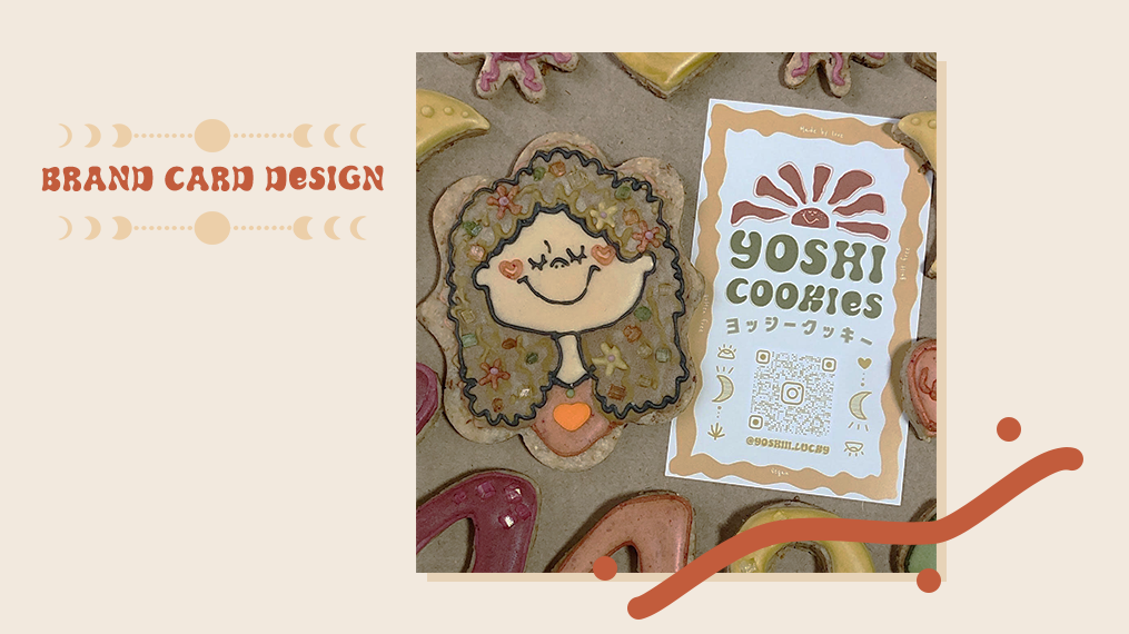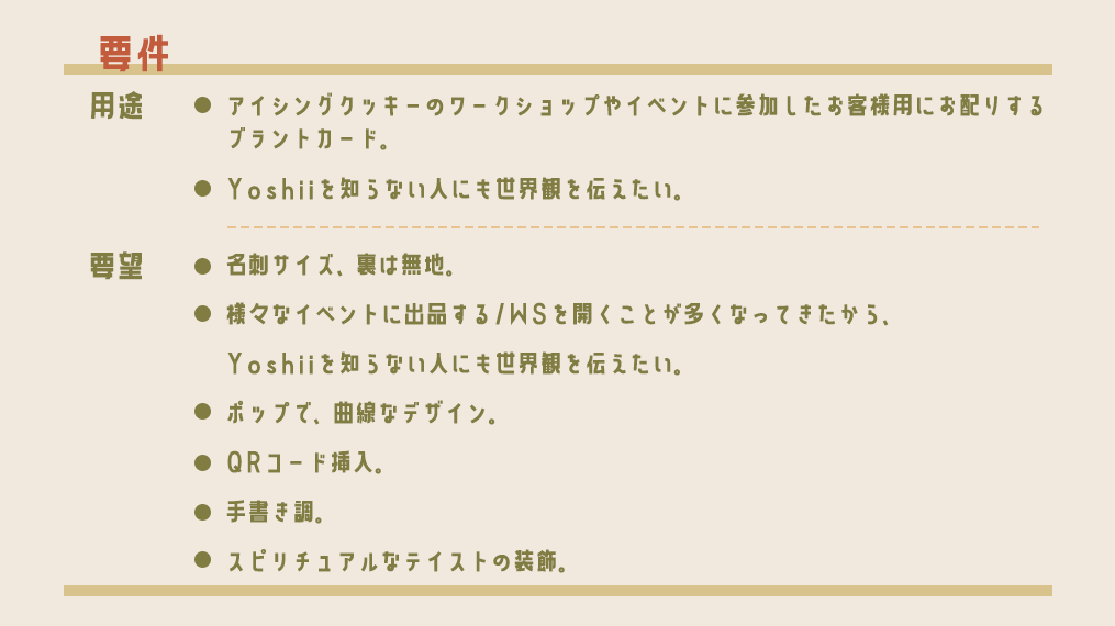 アイシングクッキーのワークショップを行っているYoshii様。 ワークショップやイベントに参加したお客様用にお配りするカードを制作しました。