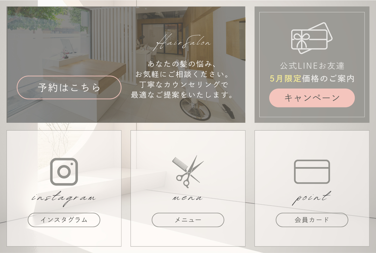 LINEリッチメニューの作成を行いました。スタイリッシュな店内と丁寧なカウンセリングが人気の美容室をテーマに、デザインを行いました。※自主制作※