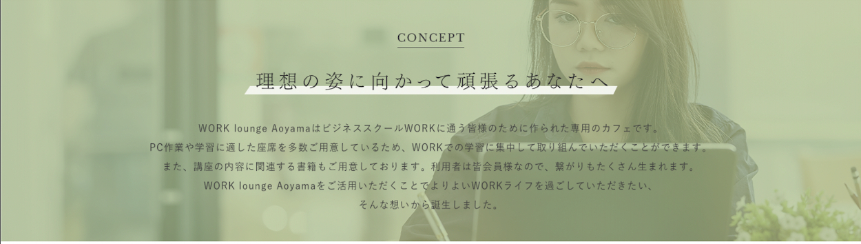 女性がパソコンに向かっている画像を背景にし、「理想の姿に向かって頑張るあなたへ」というメッセージがより伝わるようにしました。また画像には半透明の緑色をかけ、元の画像の色を抑えて、ページ内の色の統一感が出るようにしました。