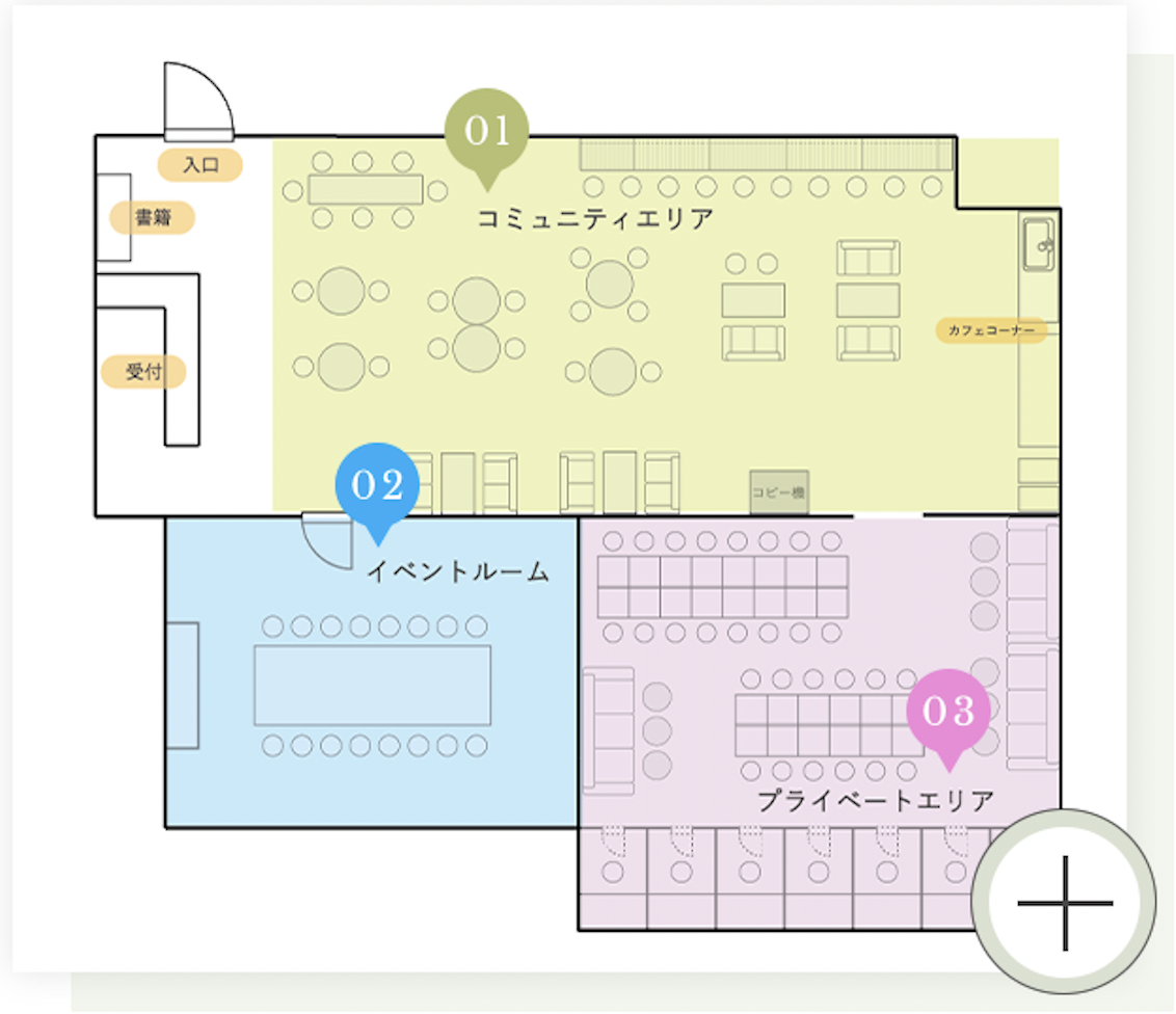 施設の間取りを作成し、どのような環境か分かるようにしました。間取りはエリアで色を分け、一目でエリアが分かるようにしました。