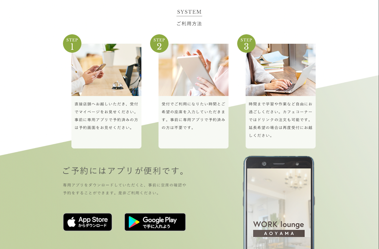「ご利用方法」にアプリについての記載があるため、アプリ情報のセクションとの繋がりが分かるよう、2つのセクションにまたいで背景に台形の図形を配置しました。