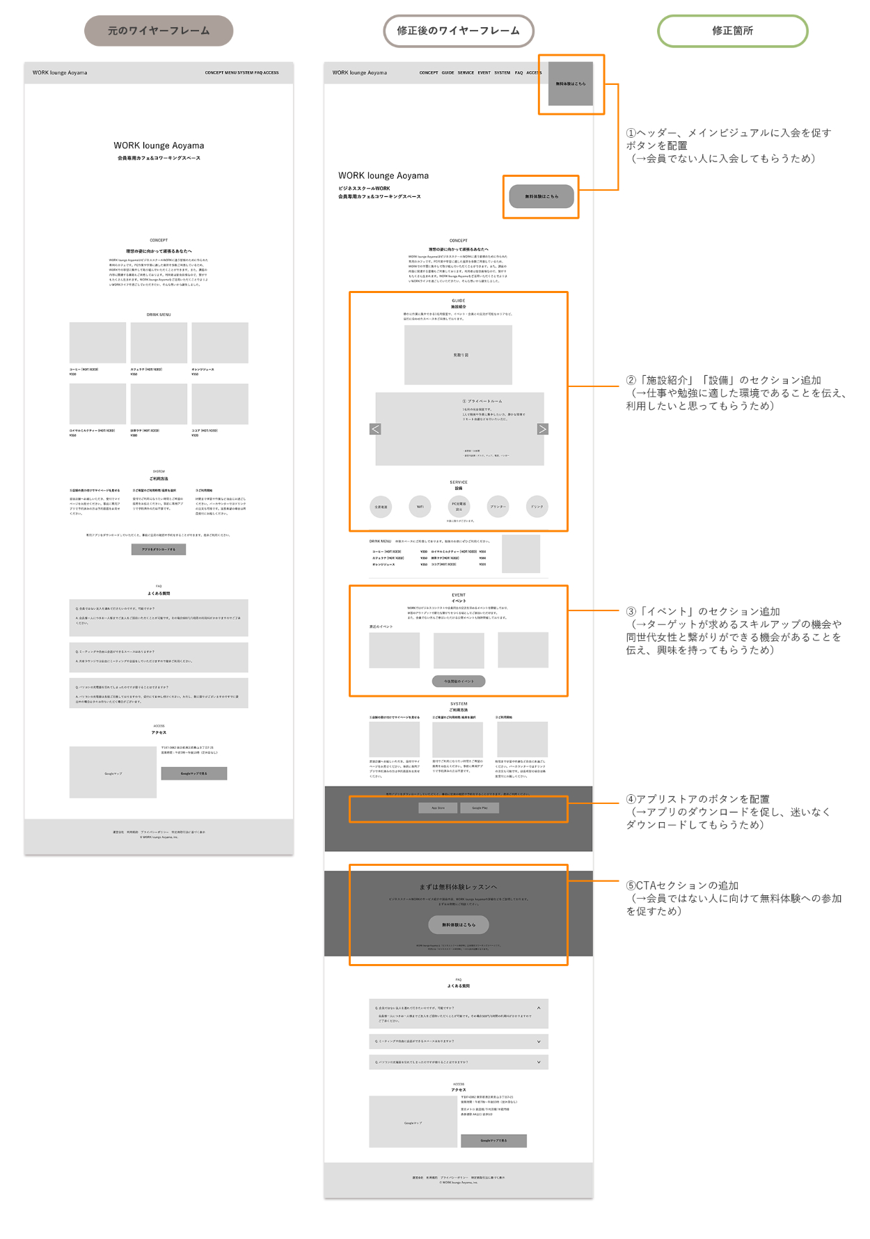 要件やペルソナを元に、ワイヤーフレームの修正をしました。