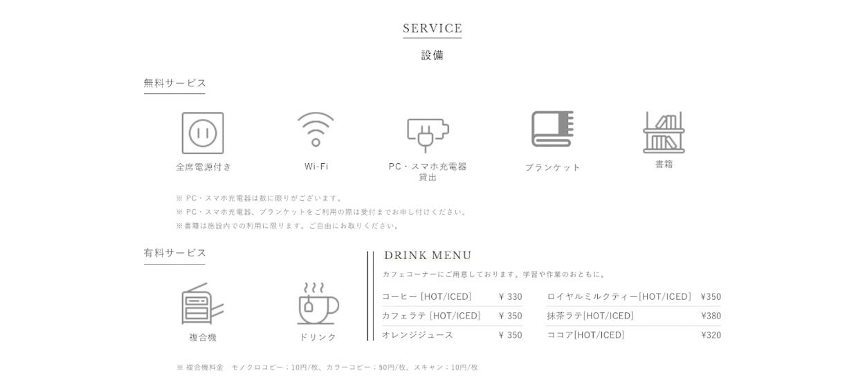 施設内の設備を記載し、学習環境の不安がないようにしました。アイコンを用いて一目で伝わるようにしました。注意書きは本文より薄い色を使用し、情報が多い印象にならないようにしました。