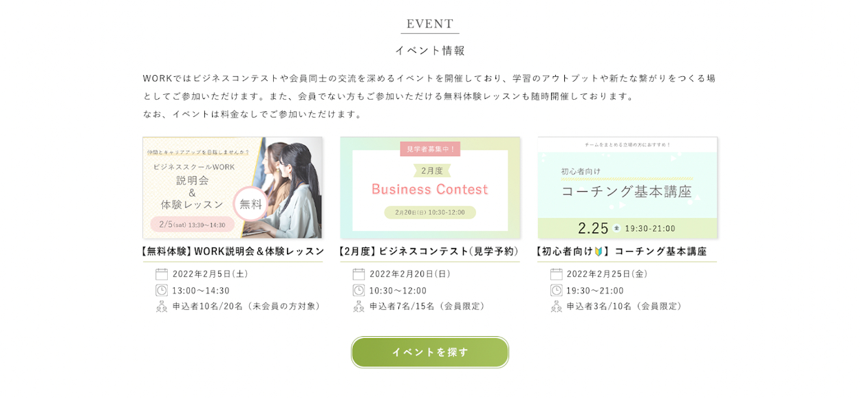 ターゲットは同世代の繋がりやスキルアップを求めているので、イベント情報を記載してニーズに応えられるようにしました。日時、申込状況を示し、このページで概要が分かるようにしました。このページでの情報を最小限にするため、記載するイベントは最大3つとし、「イベントを探す」ボタンを設置しました。