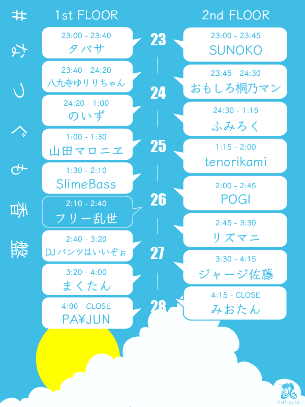 【イベントフライヤー】フライヤー制作 #なつぐも Tsubasa Motohashi デザイナー OVERVIEW クラブイベント「#なつぐも」のフライヤー制作を行いました。 YEAR 2016 渋谷club asiaで開催されたクラブイベント「#なつぐも」のフライヤー制作およびタイムテーブルの制作を行いました。CL 渋谷club asia様制作物:フライヤー、タイムテーブル