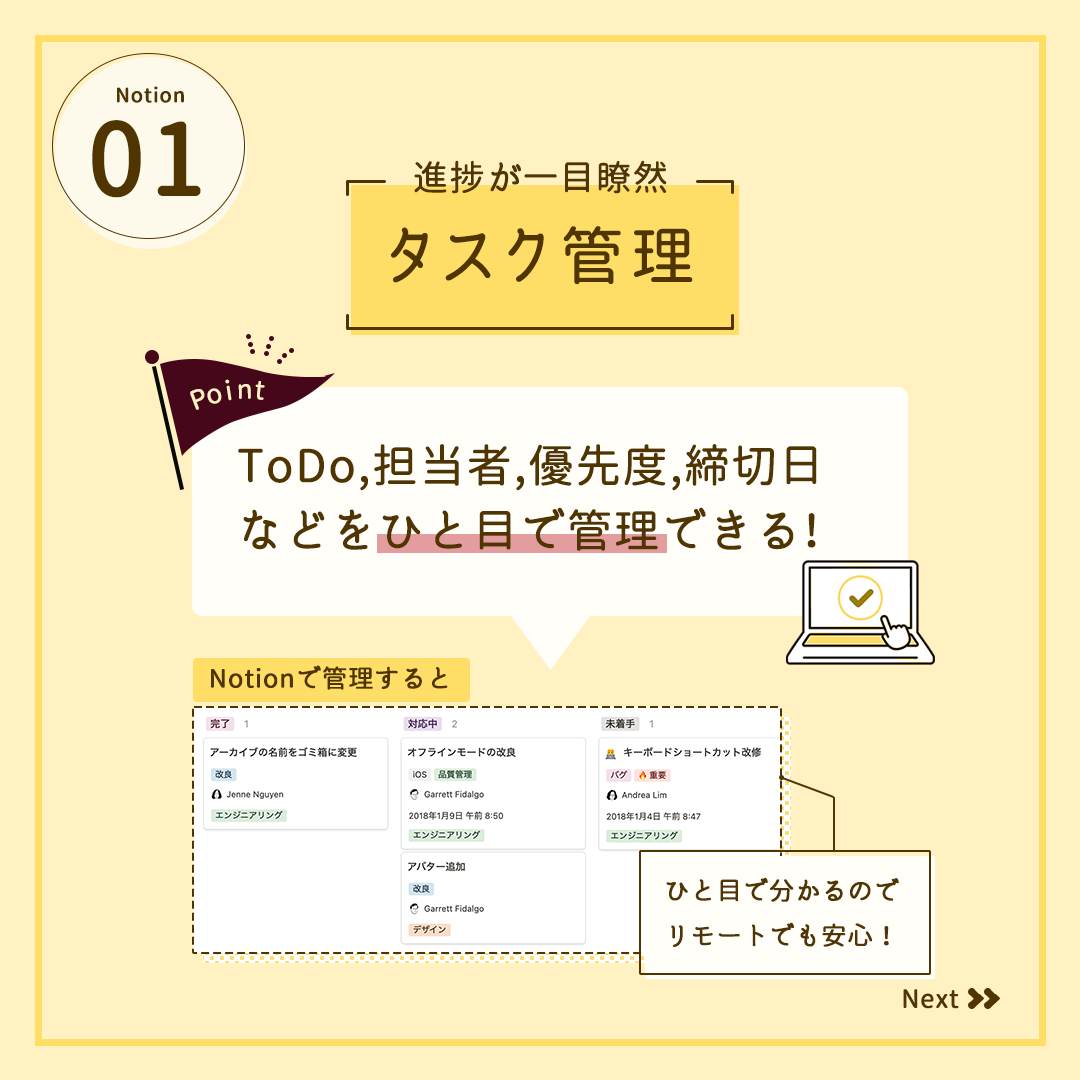 - To Do、担当者、優先度、 締切日などが一目でわかる!