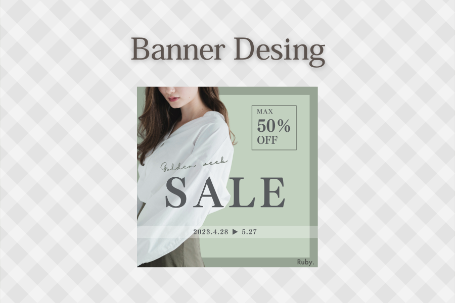 ECサイトバナーは何度か目にしたことがあったので、自分の中でイメージがしっかりあり比較的制作しやすかったです。モデルの画像はもともとお顔も入っていたのですが、服に注目してほしかったため全体の雰囲気のみバナーに入れました。今回はシンプルな印象になったため、今後もっとデザインのレパートリーを増やして凝ったバナーも作ってみたいと思いました。