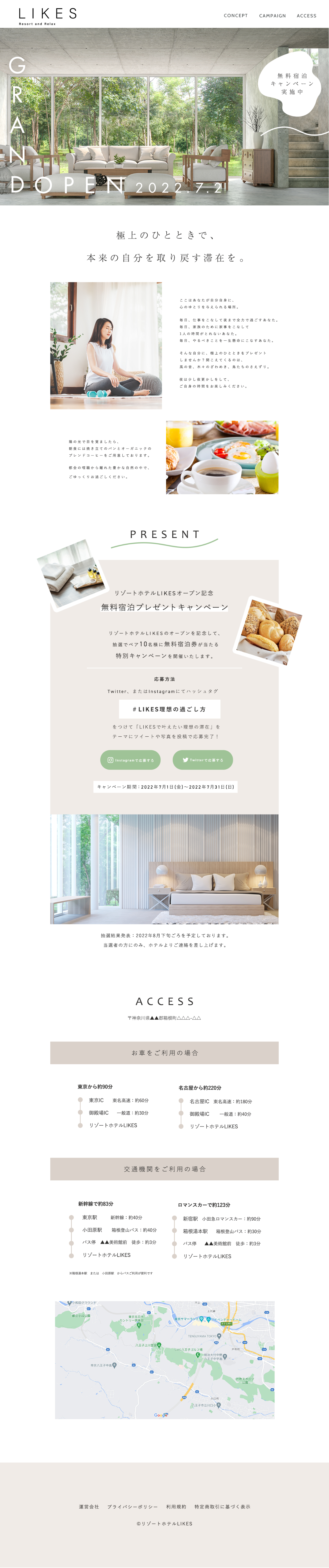 キャリアスクールSHElikesの課題制作にて「架空ホテルのLP」を制作致しました。 (情報設計/デザインカンプ)