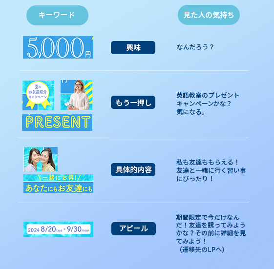・バナーを見た人の気持ちになり、ユーザーストーリーを考えながらバナーを作成すること。