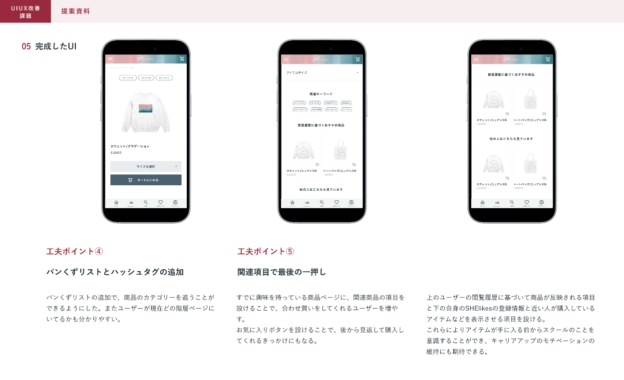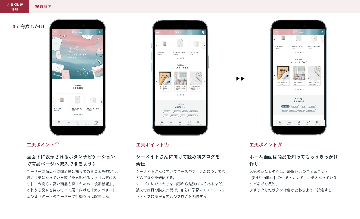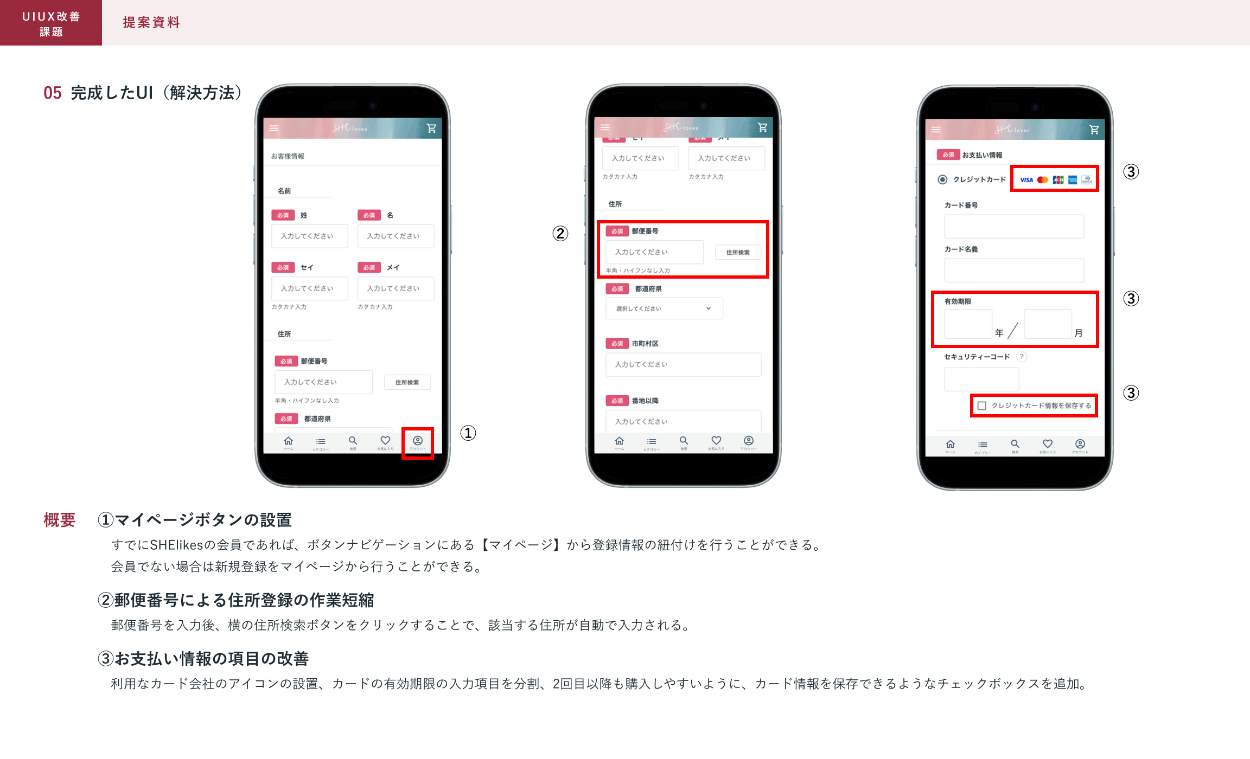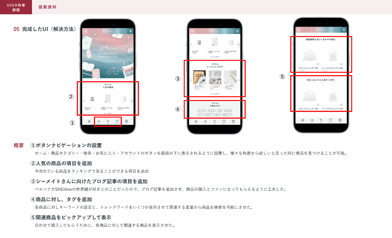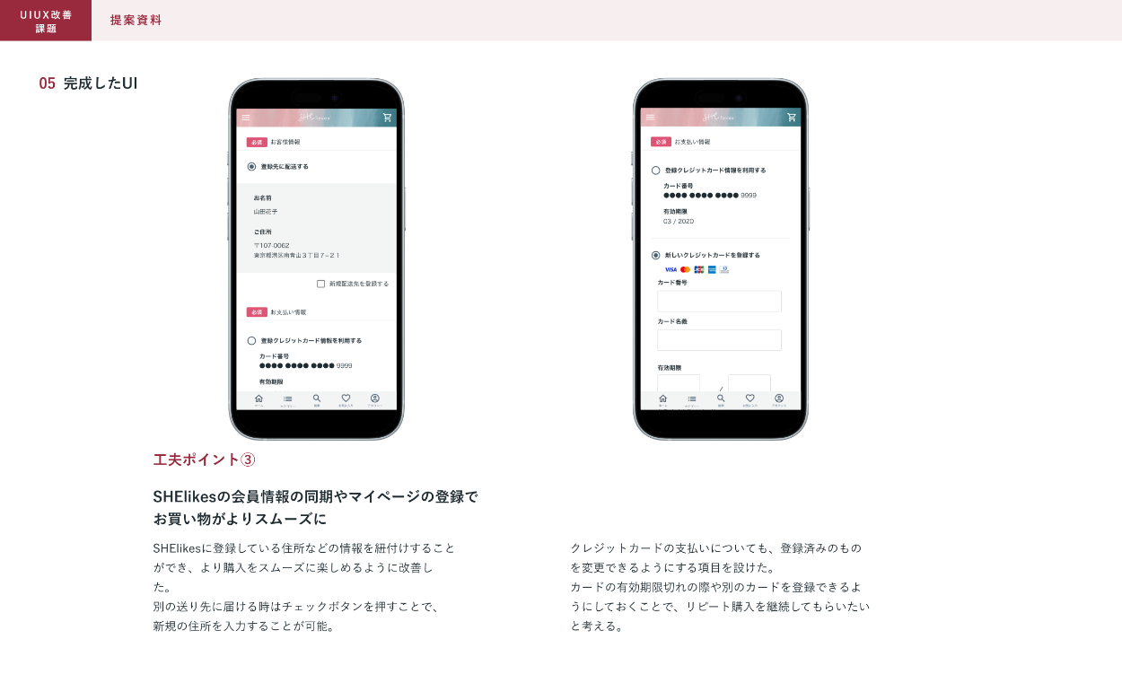 SHElikes MULTI CREATOR COURSE Designerにて、クライアントが感じている課題をUI/UXデザインによって解決する提案を行いました。 課題が発生している要因を考え、解決するUIの提案をルールやトンマナに沿って作成しました。