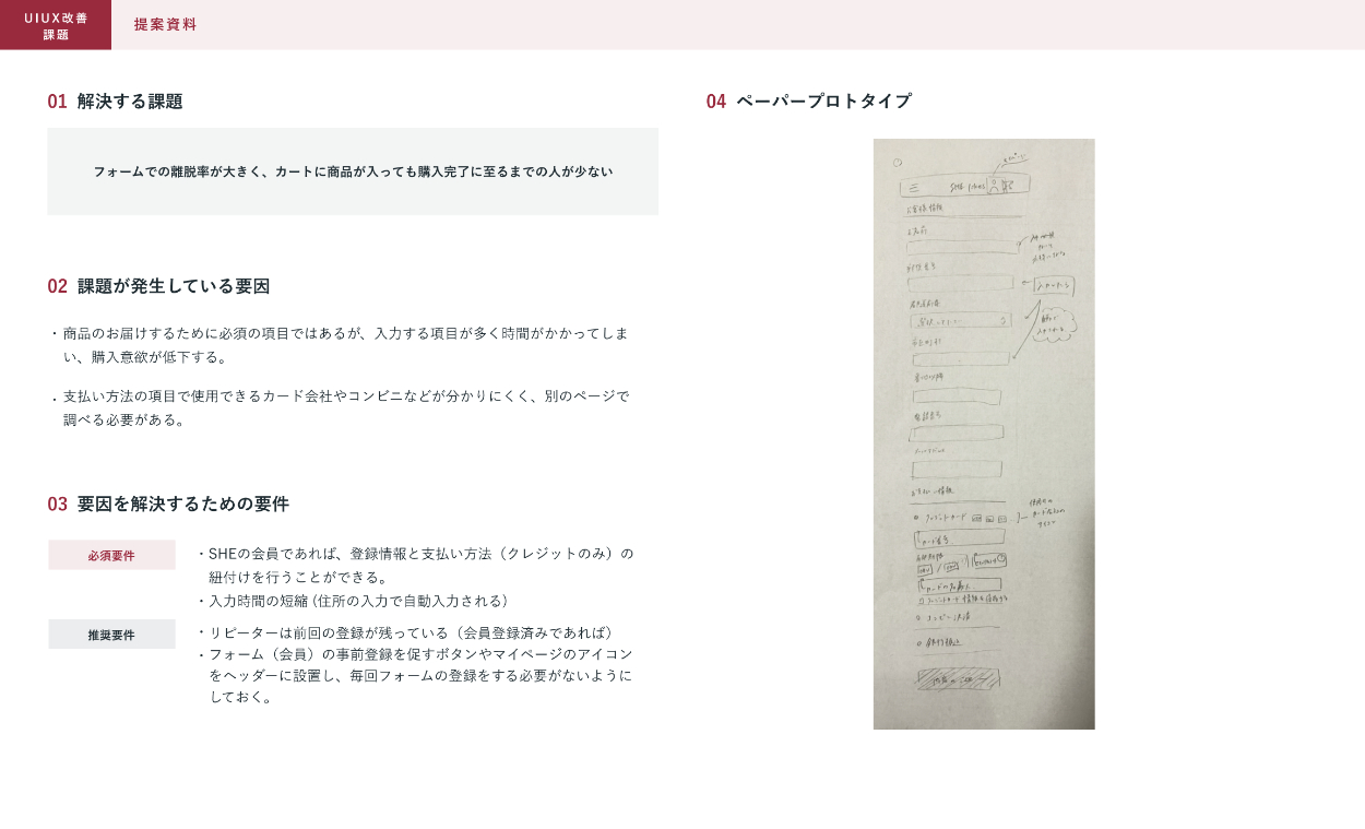 SHEのブランド展開としてECサイトを運営し始めました。さらに売り上げを伸ばすためにUIUX改善に取り組みたいと思っています。弊社が今感じている課題感を共有するので解決案を提案してください。