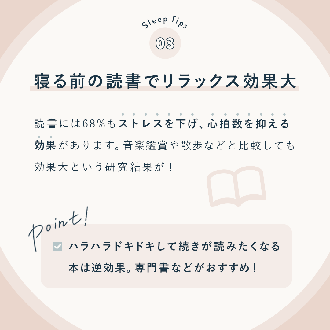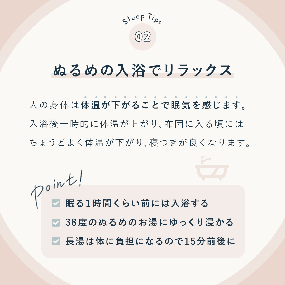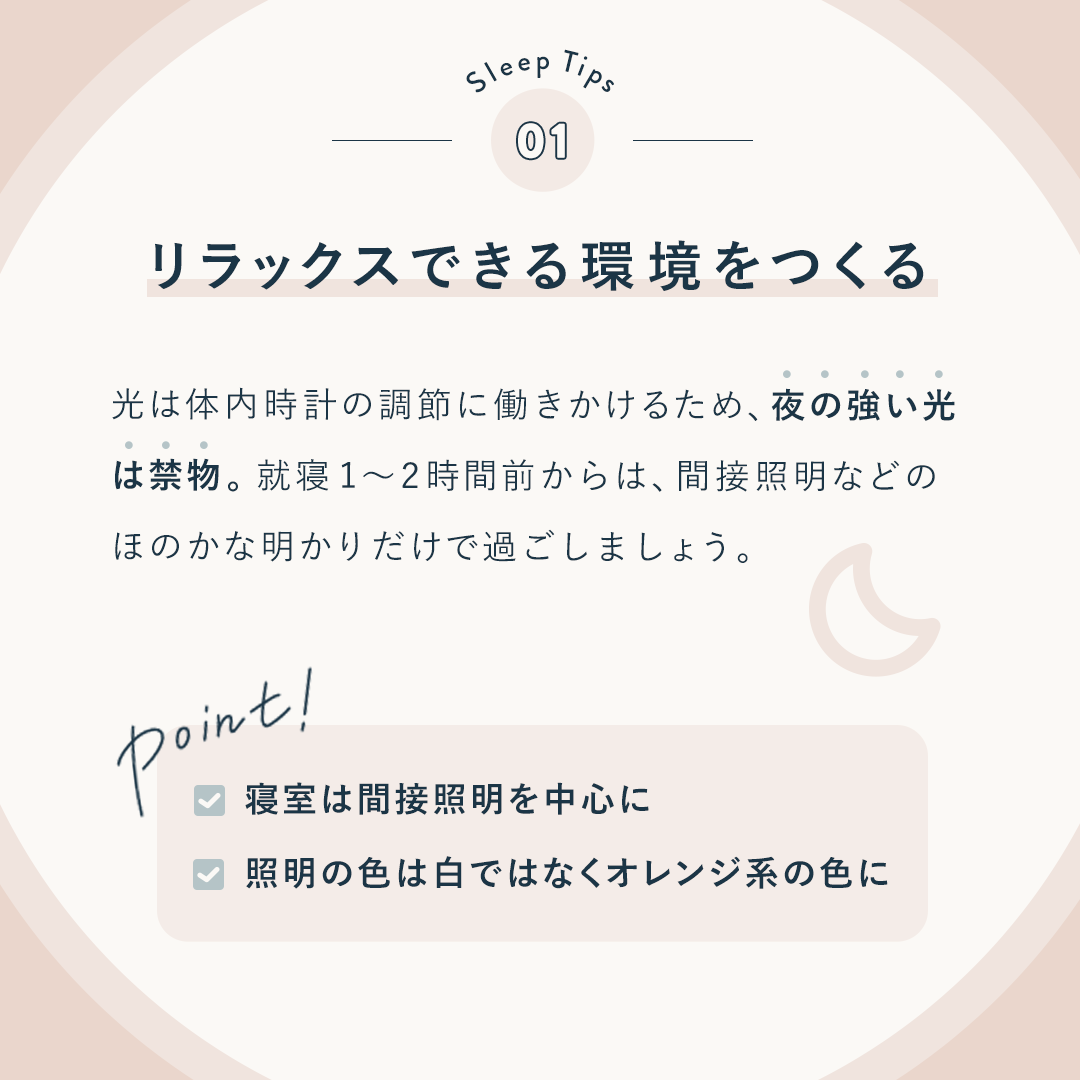 ・テーマ「心地よい睡眠のためにやること3選」に合うよう、暖かみのある配色と、間接照明の光をイメージした楕円のフレームでリラックスできるようなデザイン。
