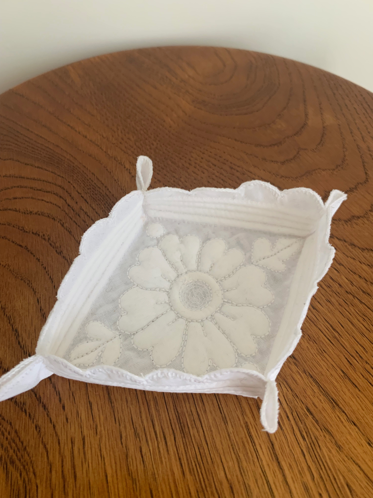 ブティ刺繍/小物入れ Mai Takaoka ブティという南フランス・プロヴァンス地方に伝わる伝統的なキルト技法で制作しました。白一色でまとめることで、ブティ刺繍特有の陰影の美しさが引き立つデザインに仕上げています。使用ツール:手縫い/縫い針