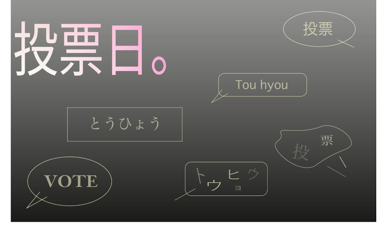 「投票」の文字をさまざまな文字(漢字、ひらがな、カタカナ、ローマ字、英単語)で表現したのは、日本社会で生きる様々な立場や背景(年齢、性別、立場、思考、etc.)を持つ人々のことを表したかったため。