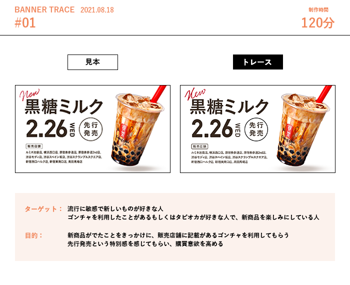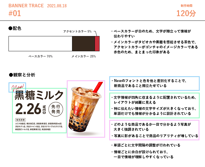 バナートレースをすることで、デザインは、誰に何を伝えるのかという目的がある上で成立っているものであると思いました。今後、バナーなどのデザインを見る際は、そのデザインが持つ目的やターゲット、構成を理解した上で、自分の作品にもその視点を取り入れていきたいと思いました。