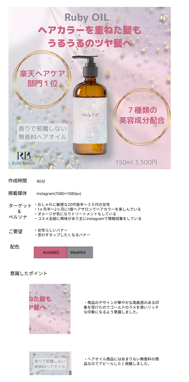 HerTech 任意課題。新作ヘアオイルの紹介バナーをCanvaで制作しました。