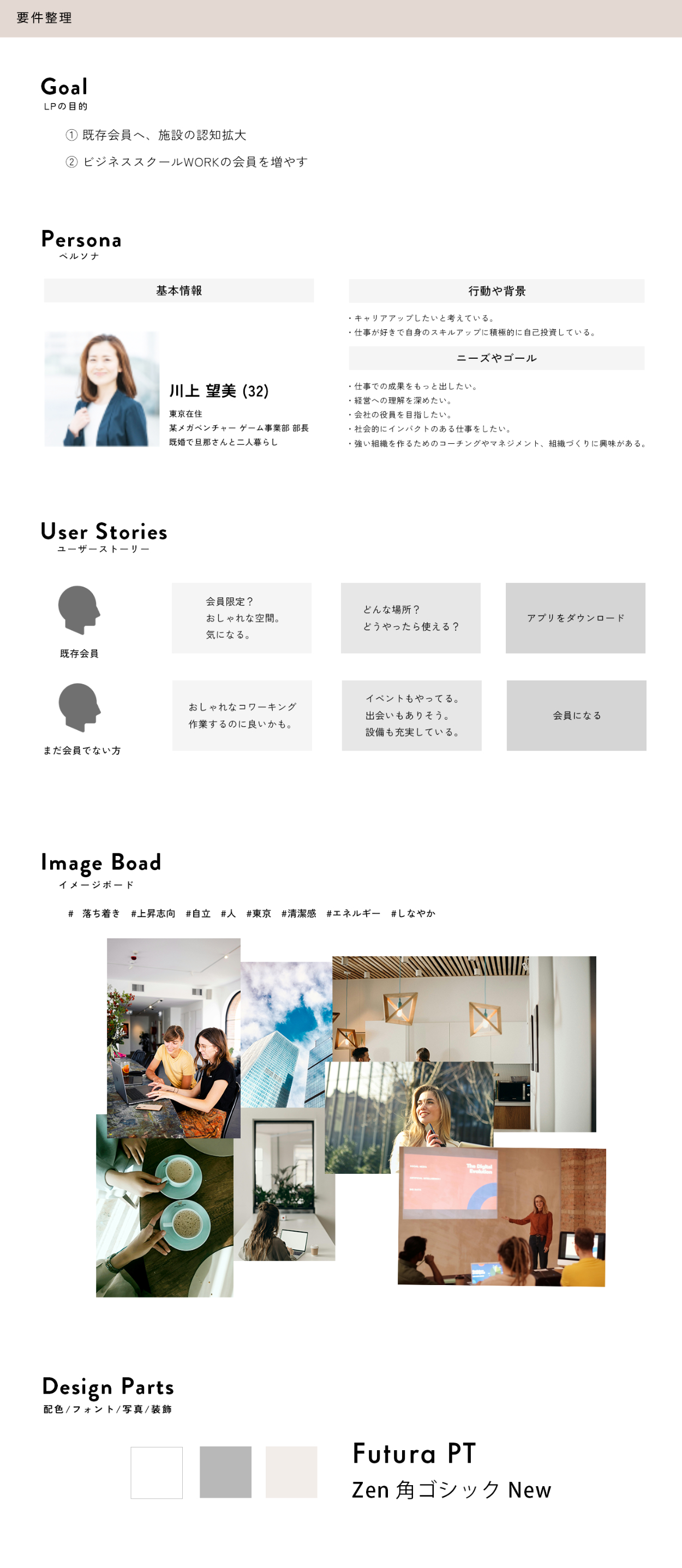 スクールの課題で、コワーキングスペースのLPを制作しました。要件定義からワイヤーフレームの修正、デザインカンプ作成までを行いました。