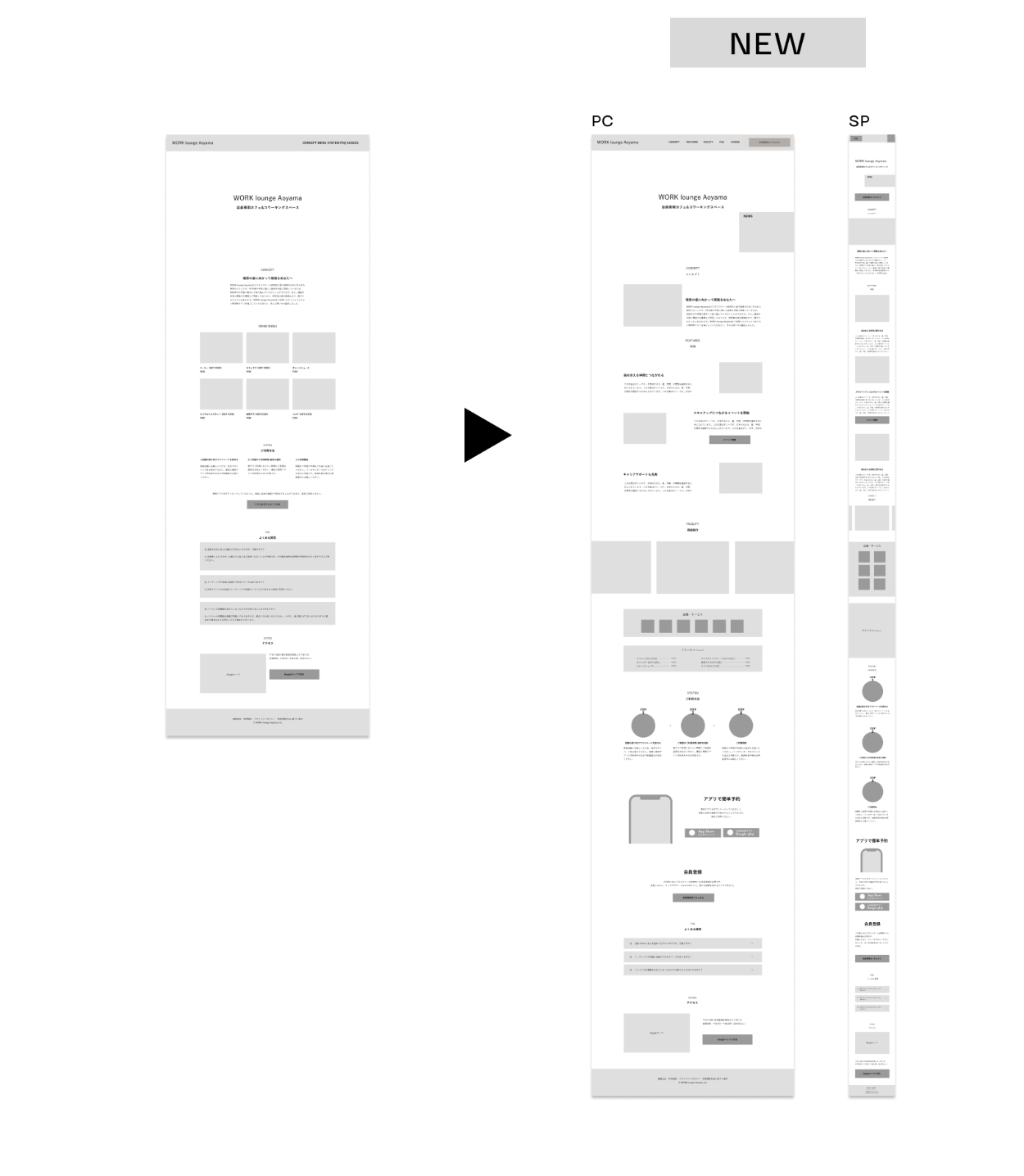 セクションの順番を入れ替えたり、足りない情報を付け足したりしたほか、レスポンシブ対応も考慮したワイヤーフレームを作成しました。