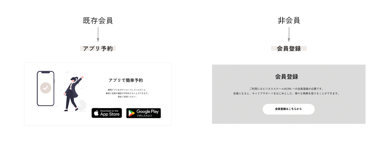 既存会員と非会員にそれぞれとってほしい行動のゴールが異なるため、必要なコンテンツを追加しました。