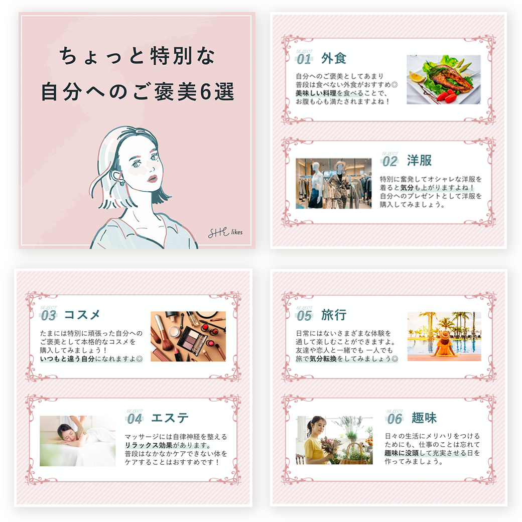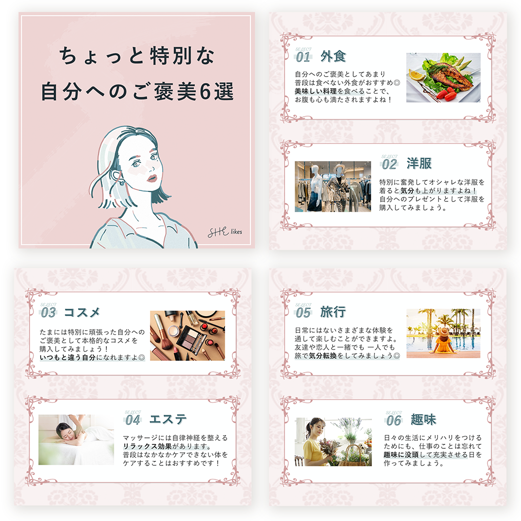 トピックがご褒美なので、全体的に高級感を意識した装飾にしました。四角の部分には、額縁をつけて豪華な雰囲気を出しました。あしらいは、Adobe Stockからダウンロードした後、Illustratorで色の編集をしました。