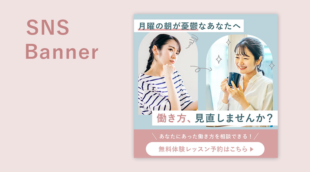 【自主制作】SNS用広告バナー Mayu Webデザイナー 【目的】オンラインスクール体験レッスン誘導、SNS用広告バナー【使用ツール】Photoshop 【制作時間】2時間【ターゲット】20~30代の女性