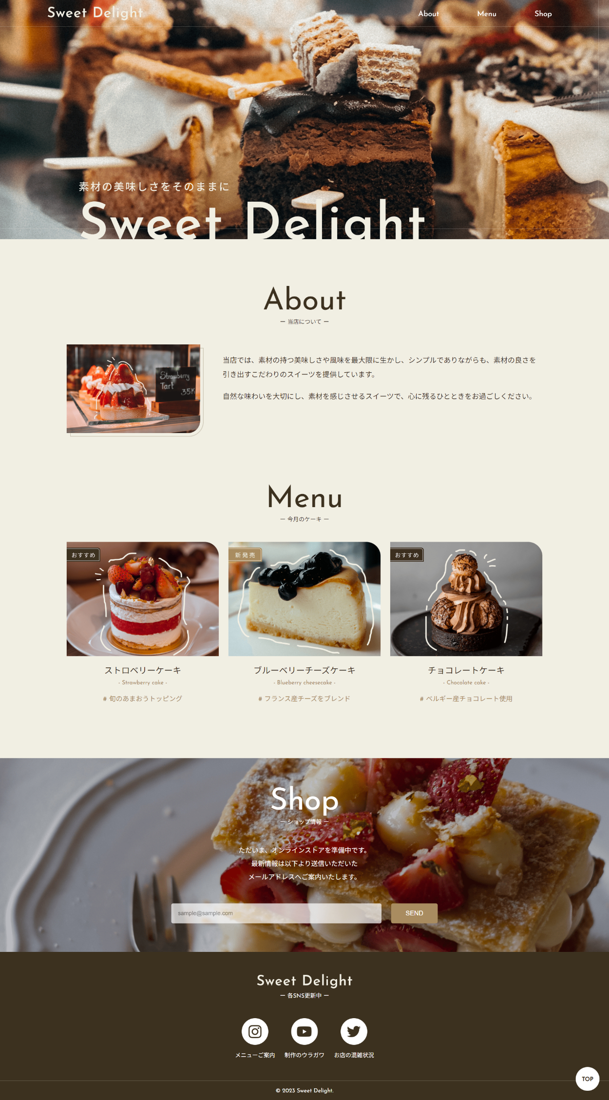 ケーキ屋さんWebサイト - コーディング Natsuki Ueno Product Designer OVERVIEW 架空のケーキ屋さんのWebサイトをデザインカンプから実装しました。 使用言語:HTML, CSS, JavaScript こちらからGithubで公開したサイトをご確認いただけます。 WEBSITE