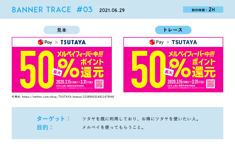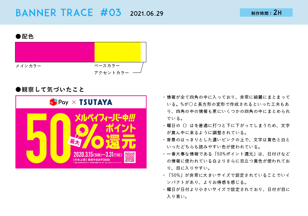 SHElikes MULTI CREATOR COURSEの課題で、バナーのトレースと分析を行いました。「なぜそのデザインになっているのか」に着目するデザインの基本知識や、デザインを見る目を養うことに繋がりました。(制作時間:5時間※トレースと資料作成含む)