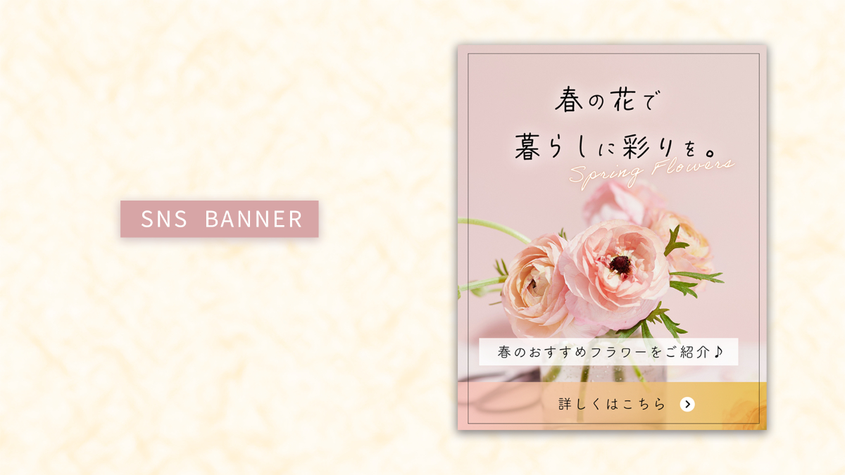 このバナーは、ターゲット層の「お部屋に春を取り入れたい!」という気持ちに寄り添い、花の魅力を直感的に伝えるデザインに仕上げました。