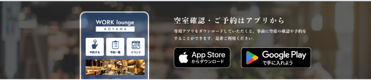 ワークラウンジの予約はアプリから行うことができるため、アプリをダウンロードしてもらうことが、もっとも重要であると考えました。アプリの導線を分かりやすく、App StoreとGoogle Playそれぞれのボタンを配置しました。実際のアプリ画面を並べて表示してダウンロード後の予約の流れも分かりやすくしています。