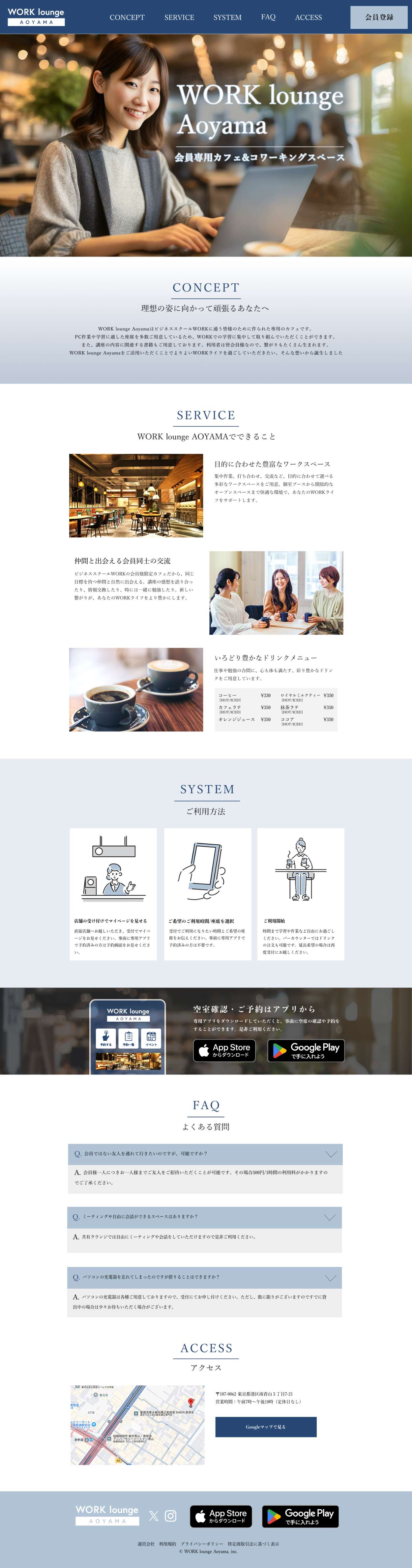 新規オープンする会員様限定のカフェ&コワーキングスペースの利用方法やアクセス情報を載せたWebサイトのデザイン制作。
