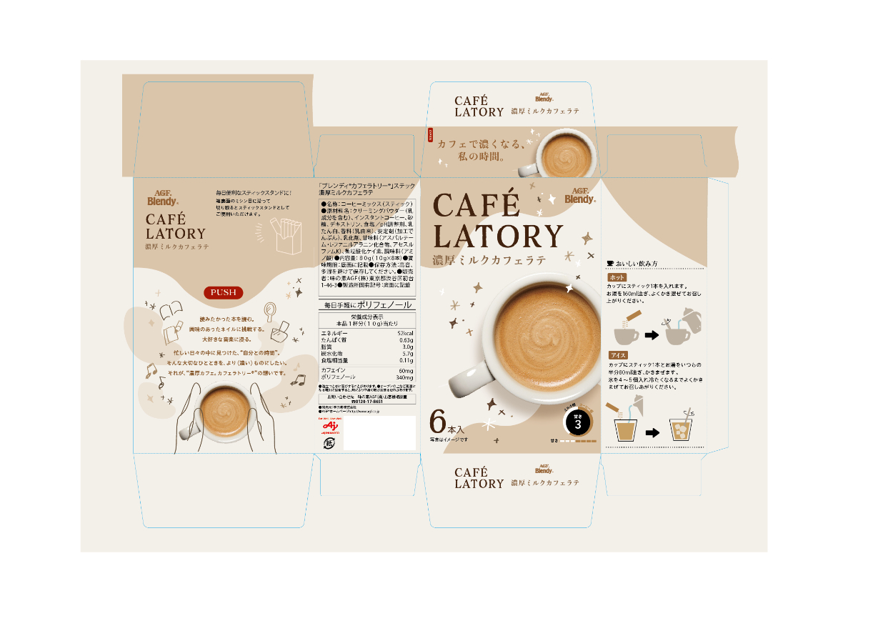 インスタントスティック「カフェラトリー」のパッケージ。 元々のコンセプトである「自分との時間」をテーマに、一息落ち着けるような落ち着いたデザインを目指した。インテリアとしてそばに置けるようなおしゃれさと、パッケージとしての可視性が両立されるよう注意した。