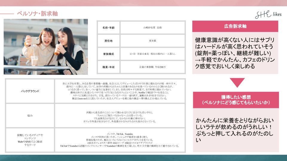 ターゲット:20代の若い女性 ペルソナ・訴求軸設定参照