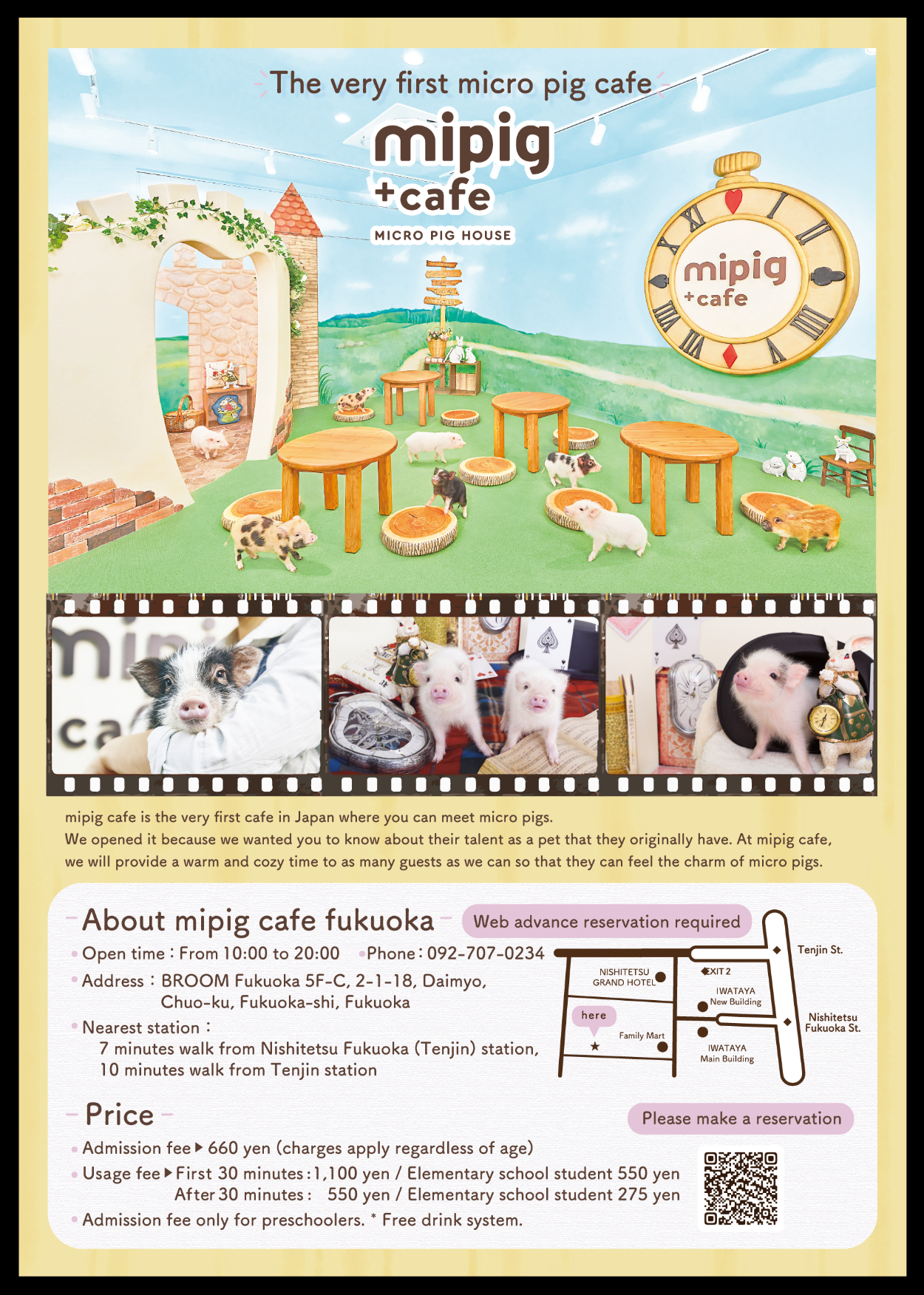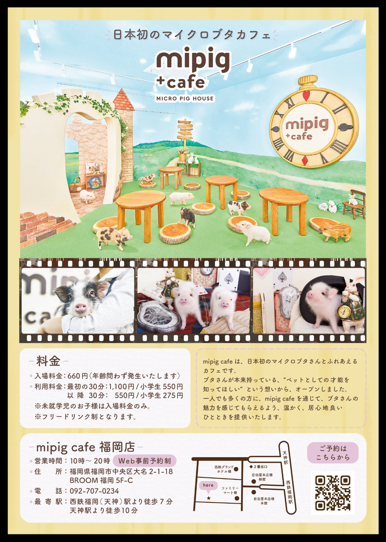 日本初 マイクロブタカフェ”mipig cafe”福岡店のチラシ制作 日本語版・英語版あり