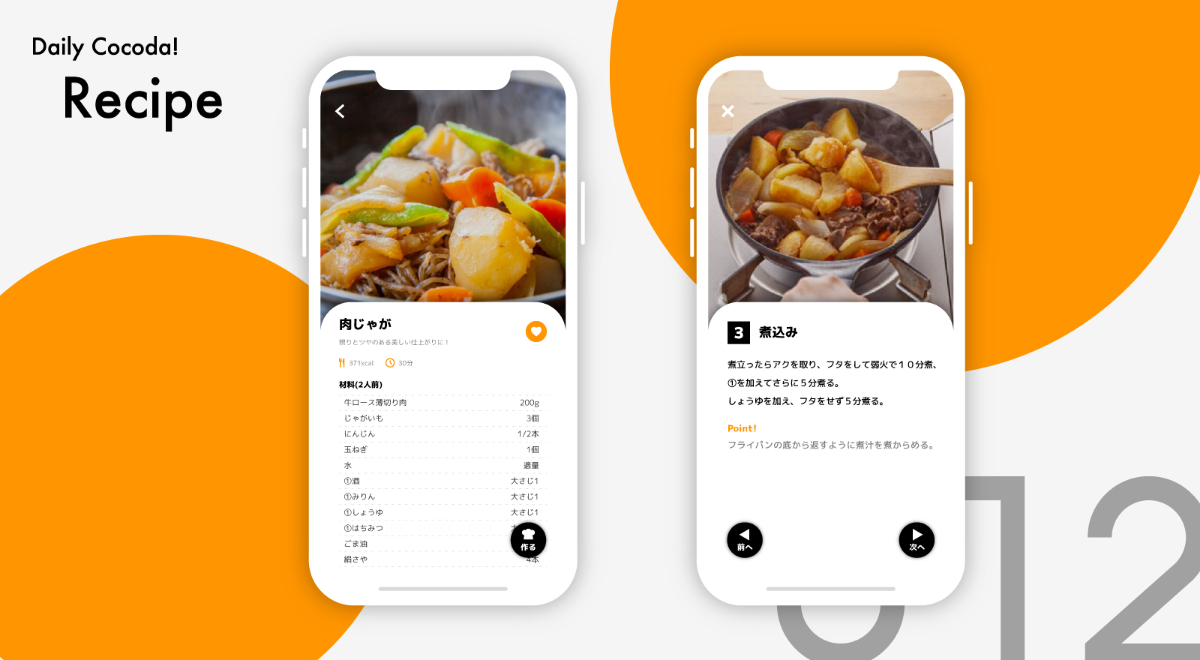 材料・手順が一覧で見れる画面(左側)と調理中に手順ひとつひとつを確認できる画面(右側)を作成しました。