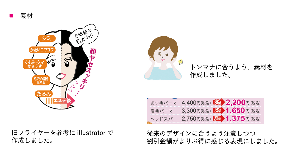 既存のフライヤーのデータが残っていなかったため、素材はillustraotorで作成しました。