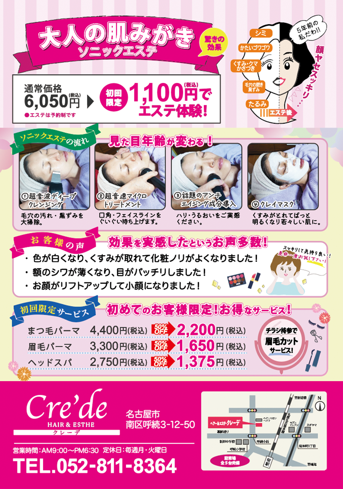 名古屋市のエステサロン「クレーデ」様のポスティング用フライヤーを作成しました。 担当:デザイン、印刷依頼