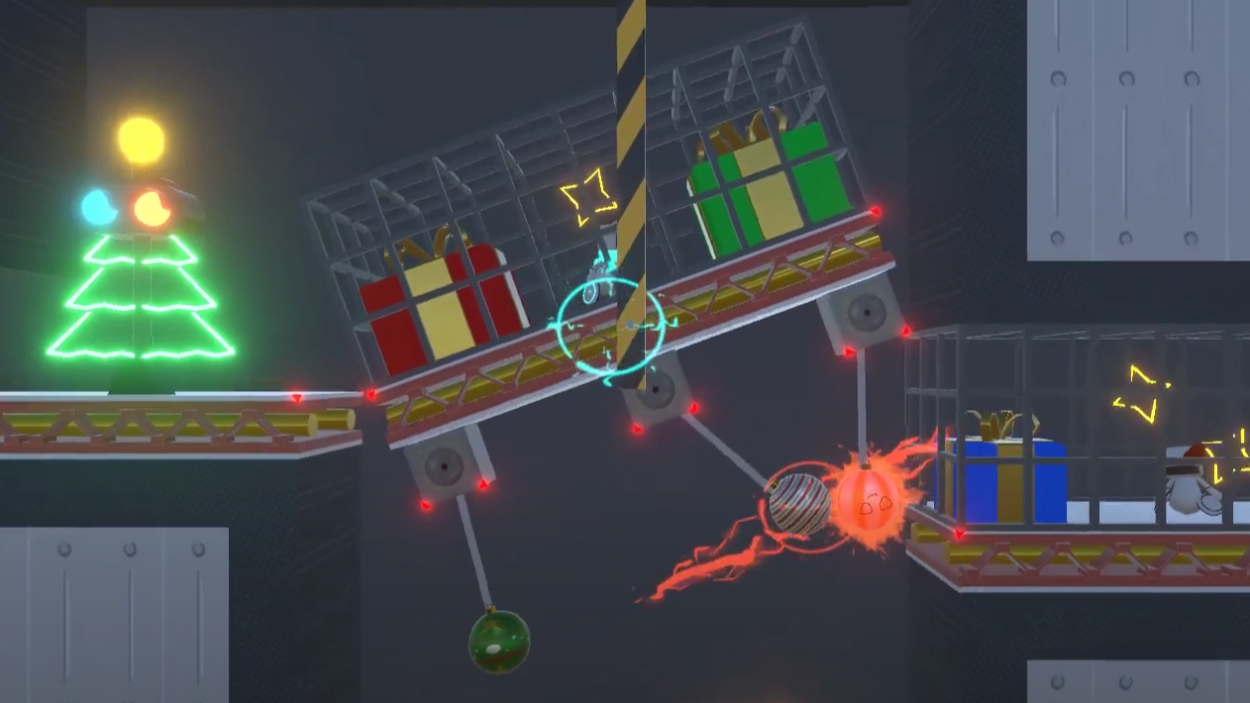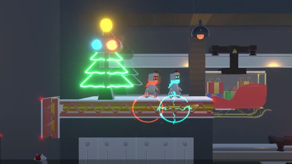 クリスマスイブの夜、暴走したプレゼント製造装置を停止させるため、「サンダ」と「グロース」は工場の中を進んでいく── 「電気の体」と「ロボットの体」を使い分け、2人のプレイヤーが協力して進む横スクロールアクション。