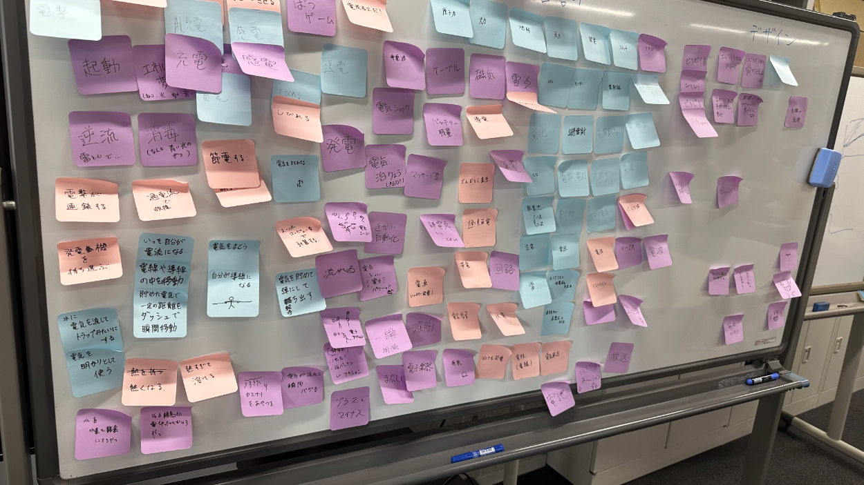 その後は「電気」をテーマにブレストをしました。この時点で「いっそ自分が電流になる」というワードが出ています。
