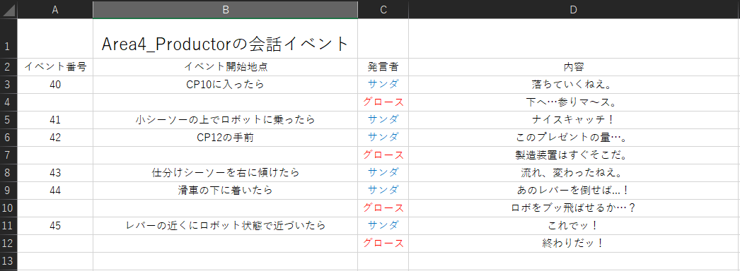 同時に世界観を補強する要素として、キャラクターの会話イベントを実装しました。2体のキャラクターの能力は全く同じなので、デザイン以外で個性を持たせるために会話イベントは役立ちました。攻略のヒントを与える存在でもあり、このゲームには欠かせない要素です。