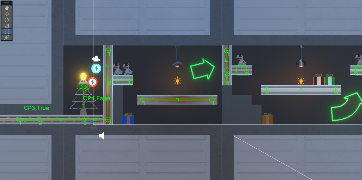 中でも力を入れたのは「ノード」システムです。「乗り移り」の対象となる金属のオブジェクトの位置は、すべて「ノード」という点同士の繋がりで表されています。電気の体で泳げるようにしたい位置にこのノードを配置していくことで、「乗り移り」の実行対象となります。