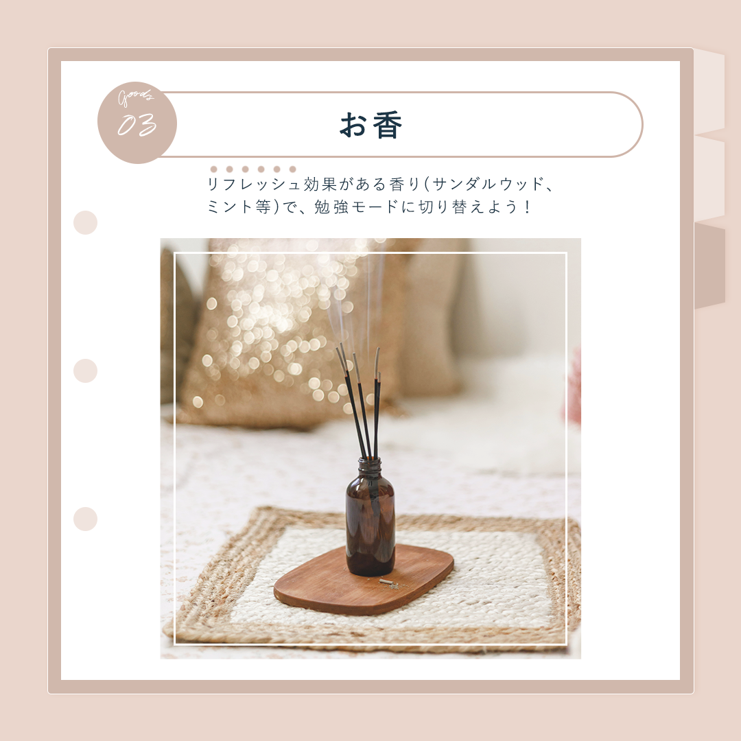 テーマ「おうちでの勉強のお供に!集中力を高めるおすすめグッズ3選」 ※スクールのSNSに投稿することを想定し、作成。 勉強のお供にぴったりなグッズの紹介を計3枚でまとめました。