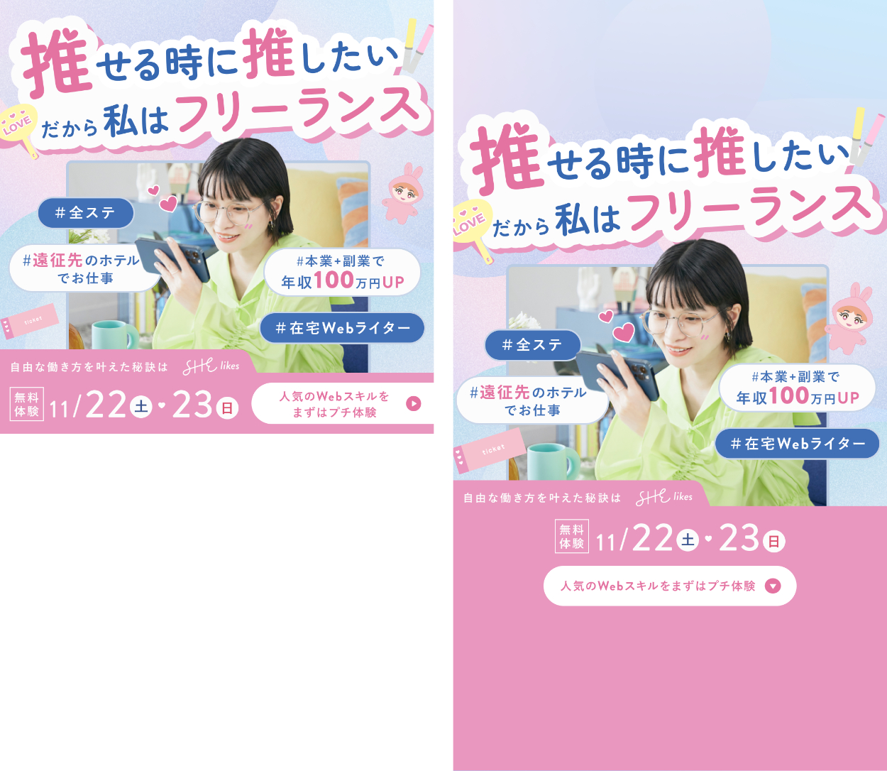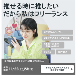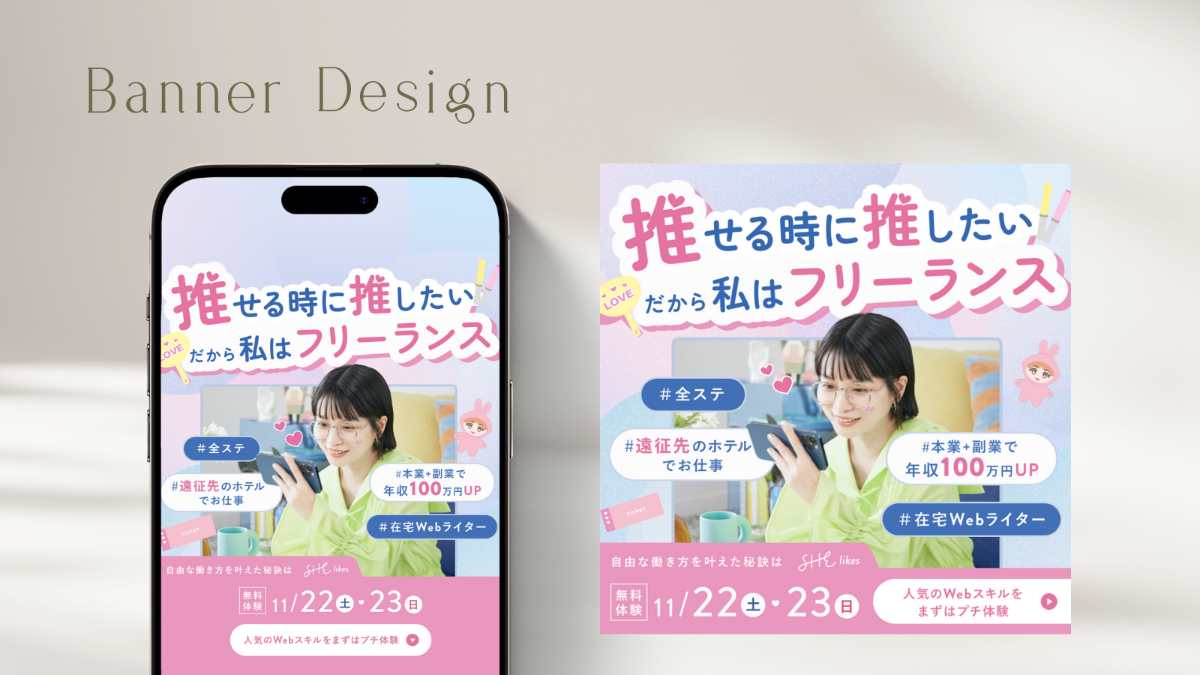 女性向けキャリアスクールを運営するSHE株式会社様のサービス「SHElikes」のSNS掲載広告バナーを制作しました。マーケティングチームの要件・ラフを元にデザインを制作しています。