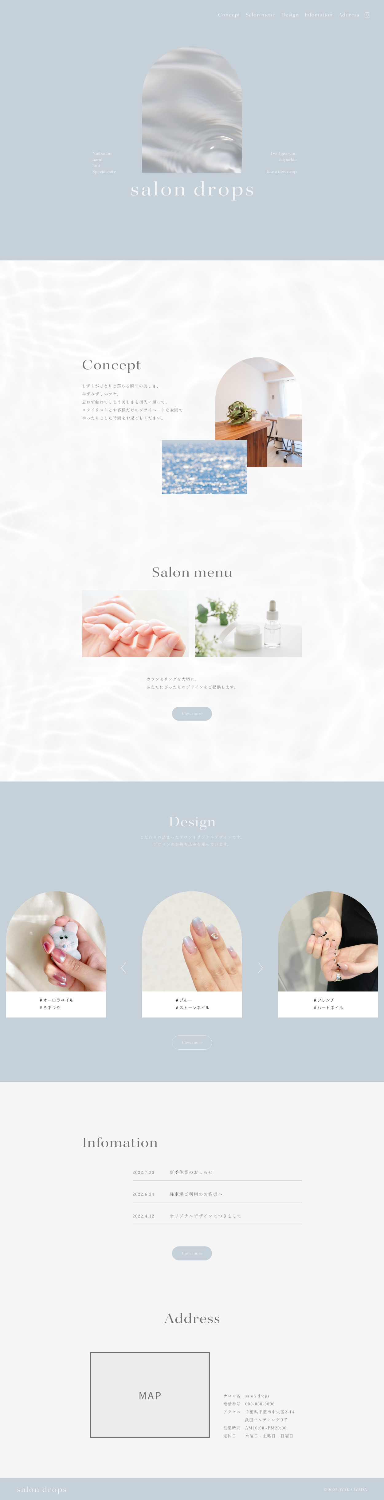 「しずくがぽとりと落ちる瞬間の美しさを指先に纏うように」のテーマのもと作られたプライベートサロンサイト。落ち着いたサロンの雰囲気と、艶のあるシンプルなネイルデザインが特徴。