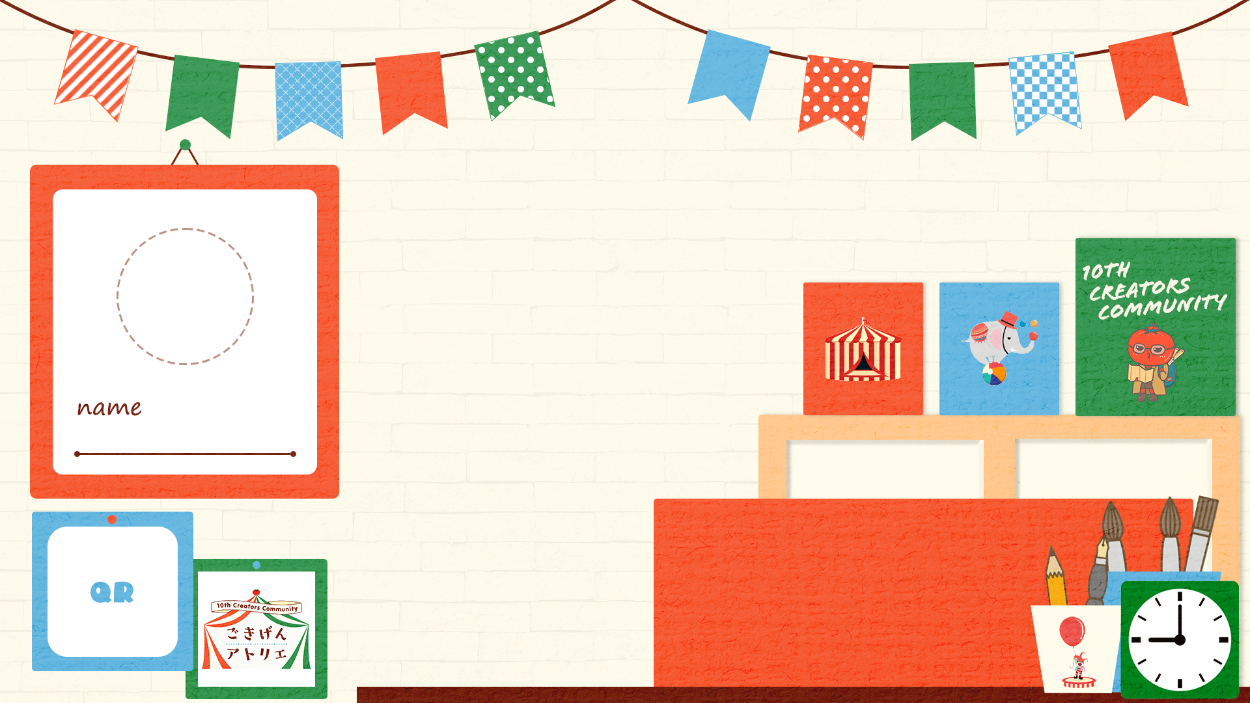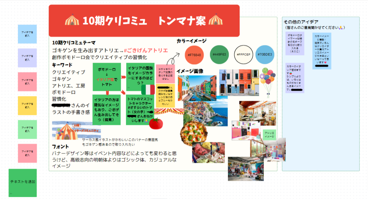 そのコミュニティ内で使用するロゴと運営メンバーがイベント内で使用する ZOOM 背景を作成。クリエイターズコミュニティのテーマとして「ゴキゲンを生み出すアトリエ」というコンセプトがあったため、そこからイメージを膨らませてトンマナを考えました。(上記イメージボード(使用ツール: Canva)※個人の名前は消しています。)