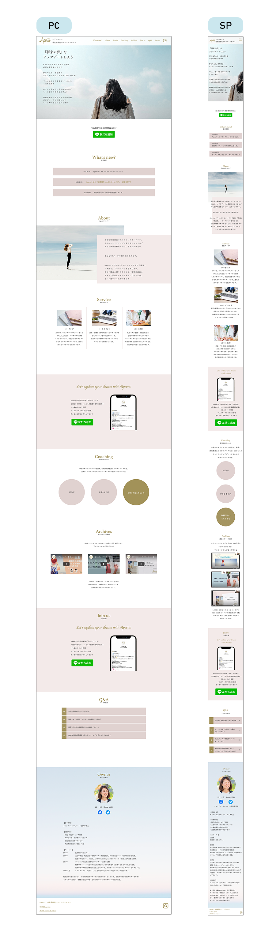 ・ベースカラーを白、メインカラーに淡いピンク、そしてアクセントにAperta様のロゴに使用されているゴールドを用いている。Apertaの意味である"開放"を白の部分や多めの余白で表現し、淡いピンクは客室乗務員が持つしなやかさや優しさを、ゴールドは新しいキャリアへ一歩を踏み出す凛とした姿勢をイメージしている。