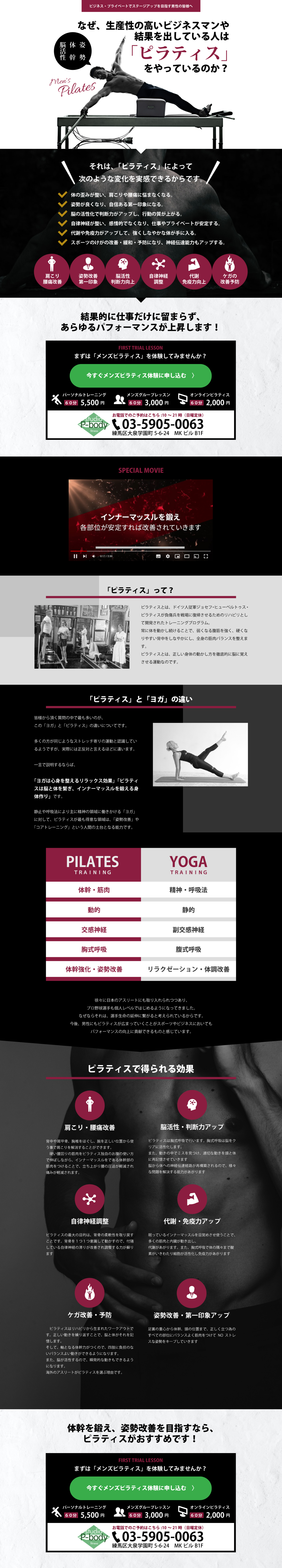 女性会員がメインのピラティスを、男性に訴求するためのランディングページ。 ダイエットやスポーツへの影響、体質改善を軸にモノクロをメインに男性らしいデザインに。